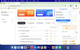 HiddenHints هو ملحق مجاني لمتصفح Chrome مصمم لتبسيط تجربتك في حل مشاكل LeetCode من خلال القضاء على المشتتات. يقوم تلقائيًا بإخفاء تقييمات الصعوبة، ونسب القبول، وعلامات الشركات، مما يسمح للمستخدمين بالتركيز فقط على المنطق وراء كل مشكلة. هذه الأداة مفيدة بشكل خاص للمطورين الذين يتطلعون إلى تعزيز مهاراتهم في حل المشكلات وبناء الثقة دون التأثر بالمقاييس الخارجية.